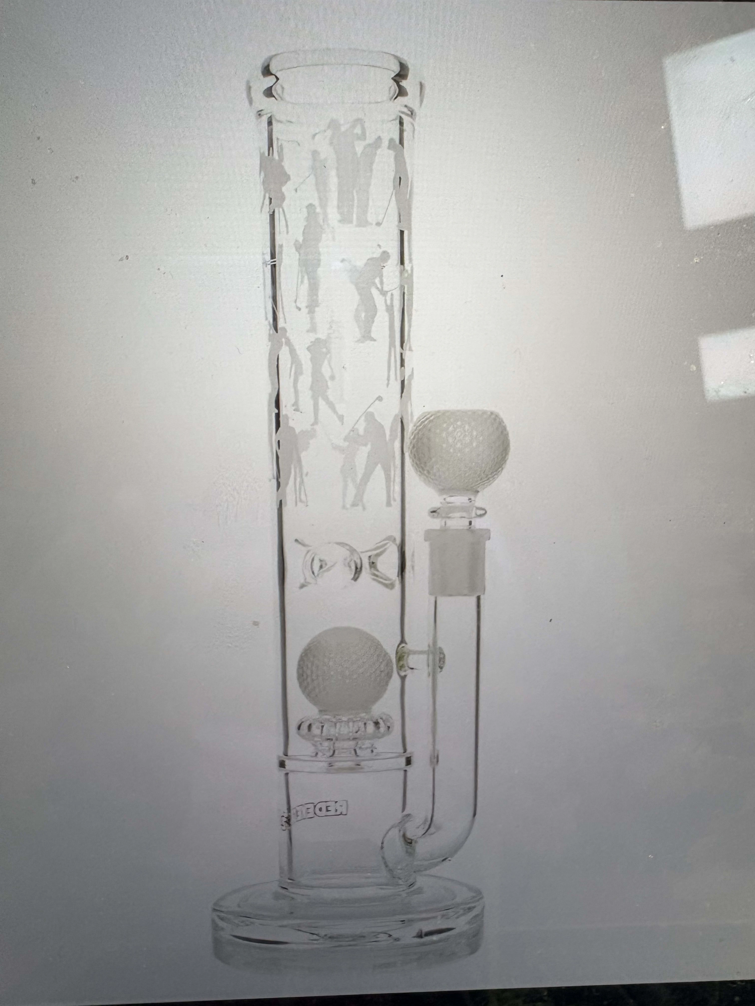 Red Eye Glass 12inch tall hole in one straight base water pipe w/gold ball perc & pull out