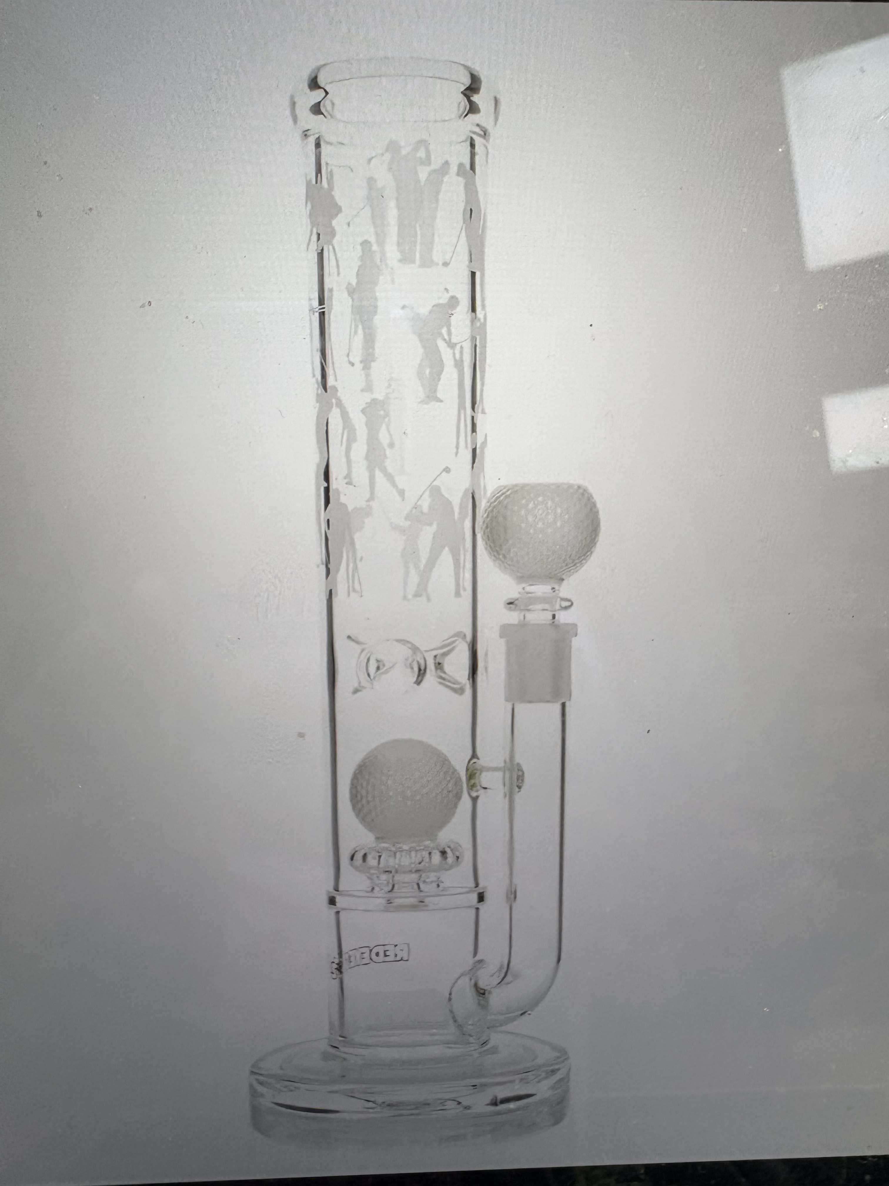 Red Eye Glass 12inch tall hole in one straight base water pipe w/gold ball perc & pull out